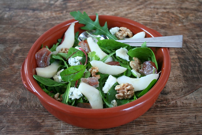 Een klassieker, deze salade met peer en blauwe kaas, die hier vaak op tafel staat. Soms als ik heel lekkere blauwe kaas heb en een rijpe peer vind ik een dressing van enkel een mooie olijfolie vaak ook al voldoende. Deze salade is ook lekker met gekaramelliseerde peer. Verwarm daarvoor in een koekenpan een klontje roomboter en 1 theelepel suiker, bak de peer dan 2 minuutjes op middelhoog vuur. Gebruik hiervoor geen heel rijpe peer.