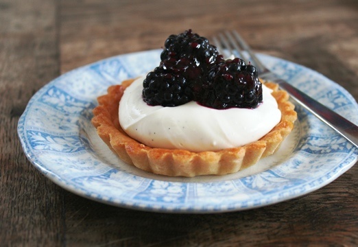 Voor de vulling: Klop de slagroom met de suiker, het merg uit het vanillestokje of een 1/2 theelepel vanille extract stijf. Klop daarna de mascarpone er door heen tot een luchtig mengsel. Verdeel het over de taartbodempjes. Smelt de jam in een pan op laag vuur, neem van het vuur en schep de bramen erdoor. Verdeel de bramen over de taartjes en serveer meteen!