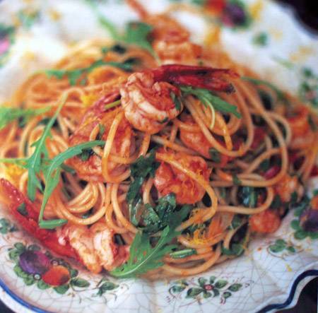 Verhit ondertussen 3 flinke scheuten olijfolie in een grote koekenpan en bak de knoflook even aan. Doe zodra de knoflook wat begint te kleuren de garnalen erbij en bak die gedurende 3 minuten. Giet de witte wijn en de tomatenpuree erbij en laat het mengsel een paar minuten pruttelen. Laat de gare pasta uitlekken in een vergiet. Hussel de spaghetti en de saus door elkaar, knijp het citroensap erover, doe de helft van de rucola erbij, en doe er zout en gemalen chili uit de molen naar smaak bij. Verdeel de pasta over vier borden en strooi er wat geraspte citroenschil en de rest van de rucola over.