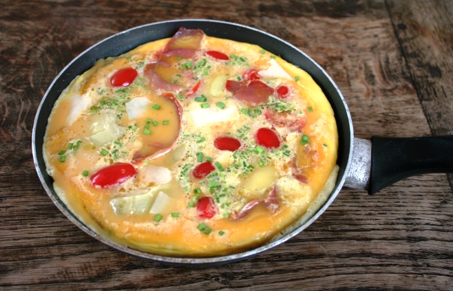 Maak de koekenpan schoon, verhit wat olijfolie in de pan en giet het eimengsel erin. Leg de tomaatjes en de artisjokkenharten er bovenop, breek de ham in stukjes en verdeel deze er ook over. Bak de frittata 5 minuten op middelhoog vuur en zet de koekenpan daarna nog zo’n 10 tot 15 minuten in de oven. De frittata is klaar zodra de bovenkant gestold is en stevig aanvoelt. Laat de tortilla op een bord glijden, knip er nog wat bieslook over en eet het met wat geroosterd brood met roomboter of een groene salade.