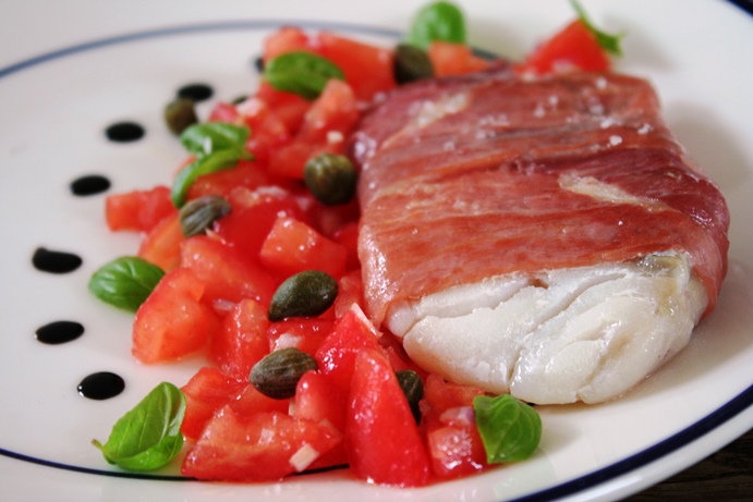 Bestrooi de kabeljauwfilets met peper en omwikkel ze met de ham. Bak de kabeljauwfilets op middelhoog vuur in olie of boter in zo’n 5-10 minuten gaar, afhankelijk van hoe dik je kabeljauwfilets zijn.