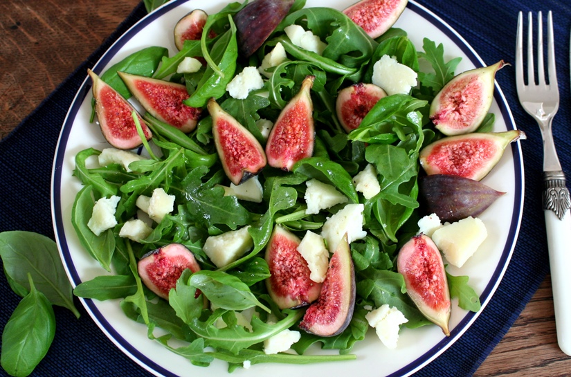 Een salade met verse vijgen vandaag omdat het weer volop vijgenseizoen is en de boom tegenover mijn huis vol zit met mooie rijpe exemplaren! De combinatie van peperige rucola, zoute pecorino, zoete vijgen en frisse basilicum is weer subliem gevonden door Ottolenghi.