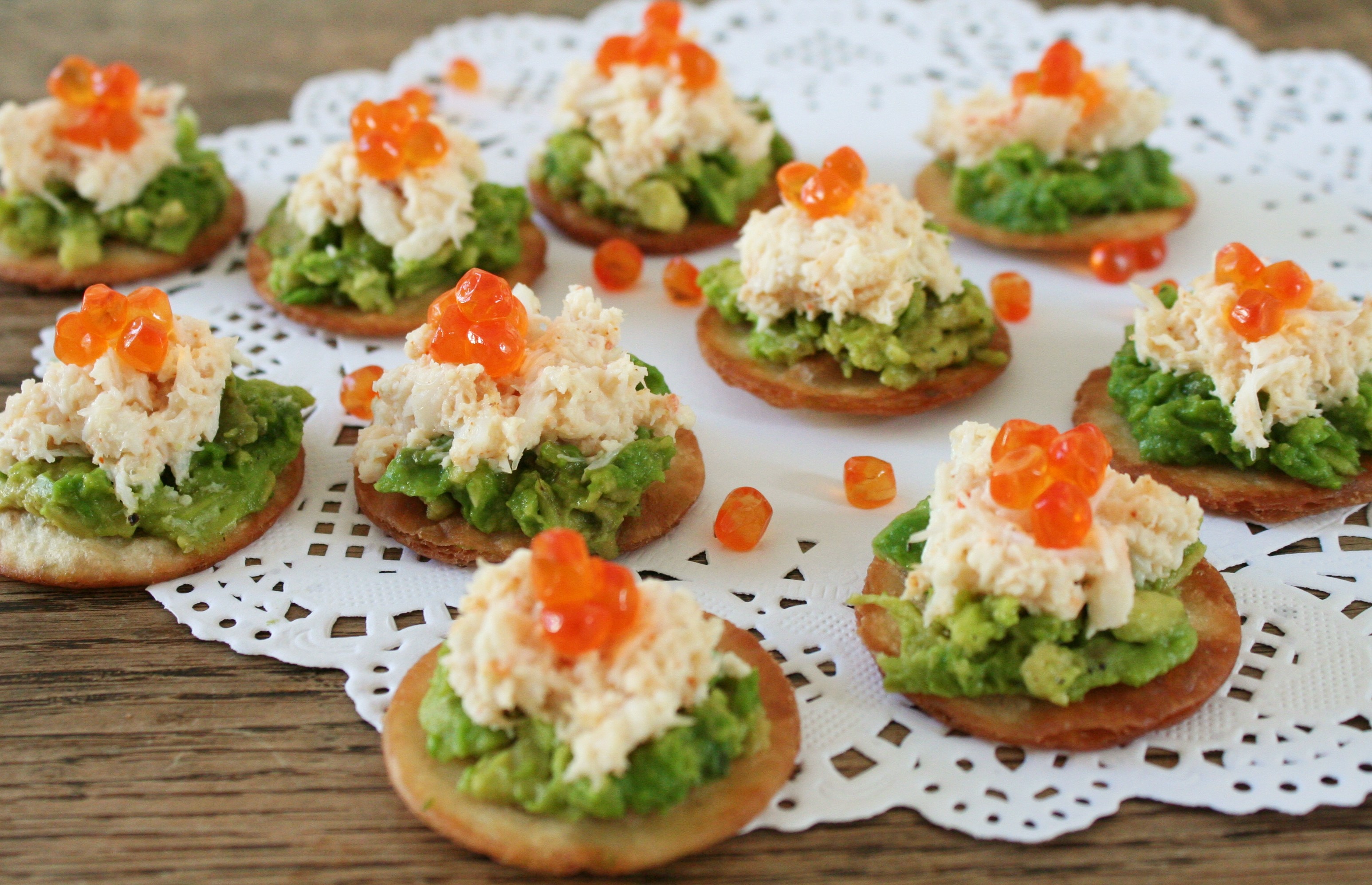 Lepel de gepureerde avocado op de tortillatoastjes, gevolgd door een lepeltje krab en garneer tot slot met wat kaviaar.