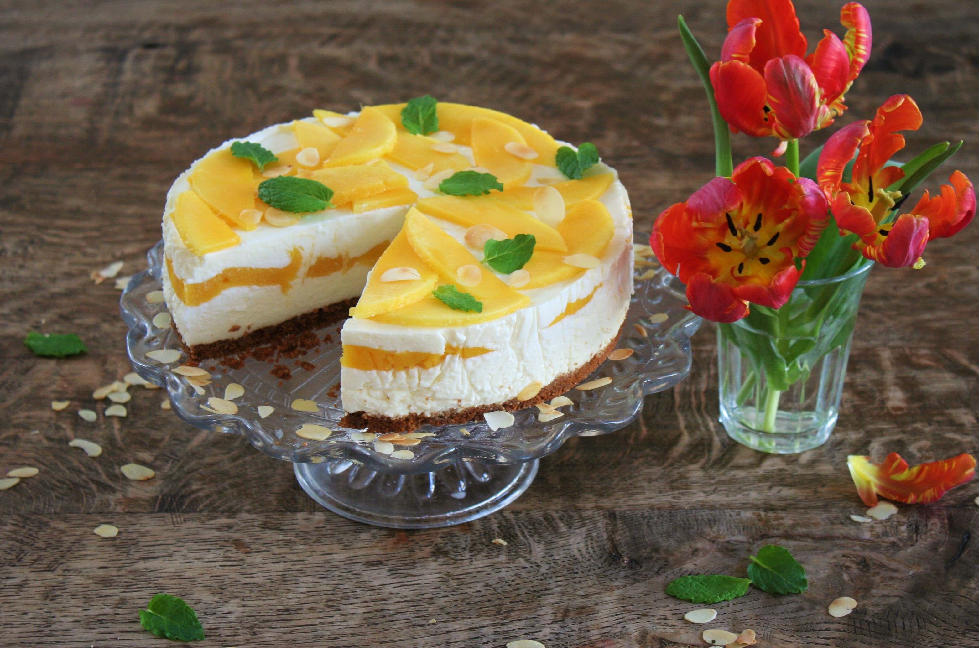 Maak de taart eventueel op met wat verse reepjes mango, amandelschaafsel en muntblaadjes.