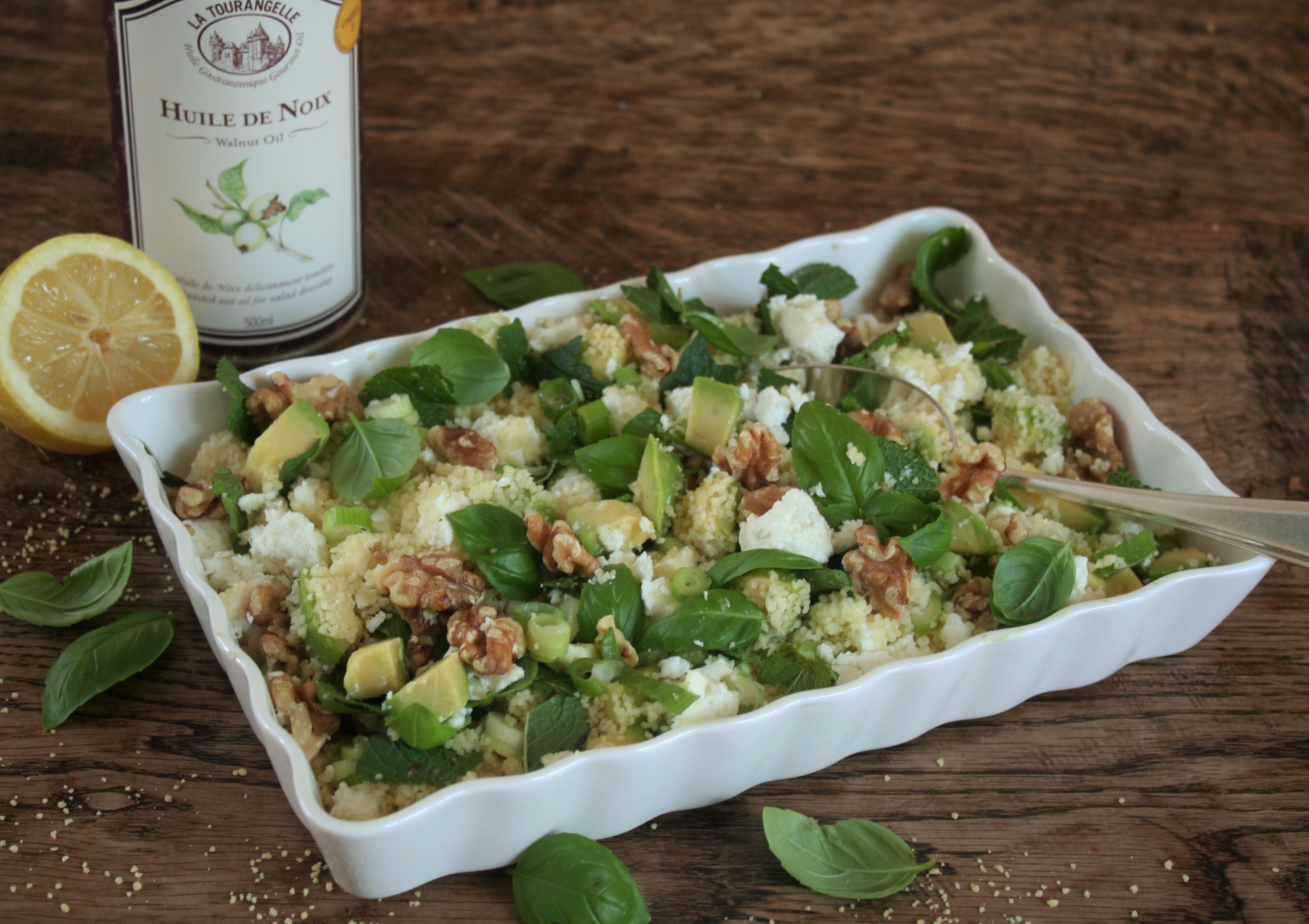 Snijd ondertussen de lente-ui in fijne ringen. Snijd de feta, komkommer en avocado in grove blokjes. Rooster de walnoten in een droge koekenpan. Scheur de basilicum en munt blaadjes en meng alles door de couscous. Breng op smaak met flink wat peper, zout, citroensap en -rasp en met walnootolie of olijfolie.