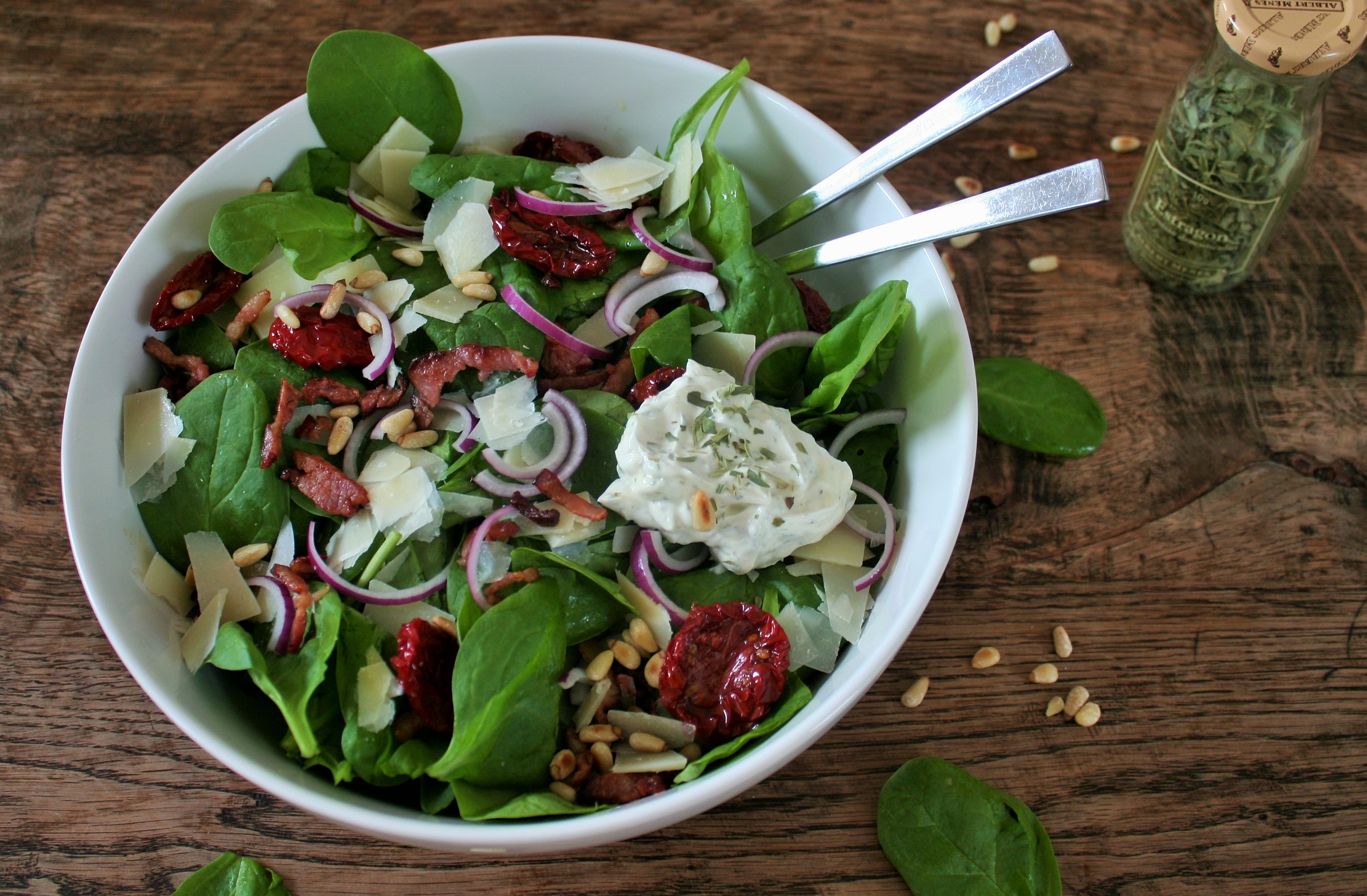 Doe de spinazie in een grote kom, meng de dressing erdoor en verdeel tot slot alle andere ingrediënten erover.