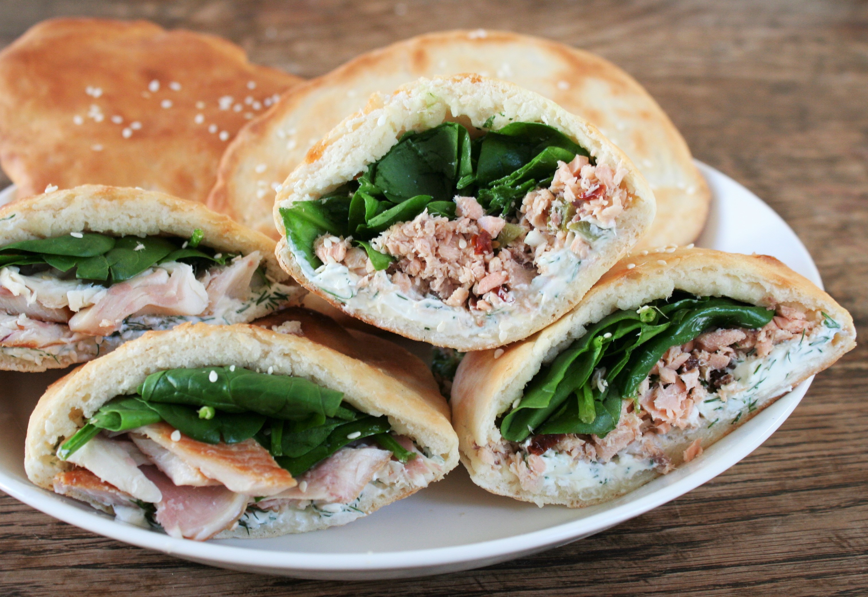 Homemade naanbroodjes met gerookte forel, spinazie en dille roomkaas