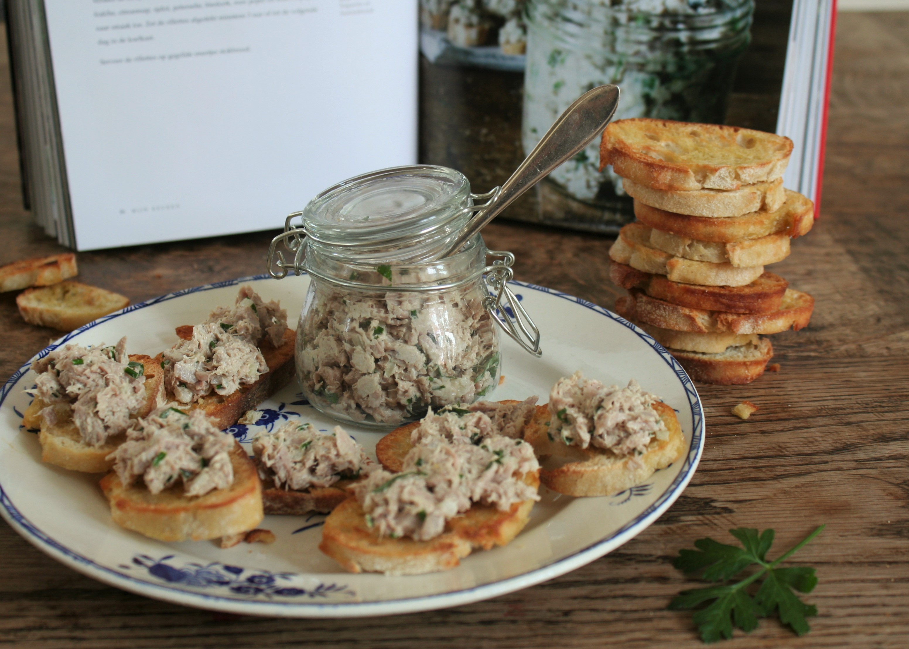 Rilettes is een Franse specialiteit, het is een patéachtig smeerseltje dat meestal bestaat uit wat grovere stukjes vlees dat in eigen vet is gegaard. Het is overal in Frankrijk te koop en iedere streek of slager heeft een eigen recept. Deze tonijnrilettes is top, lekker gekruid en stukken minder vet dan de variant met eend of varkensvlees. Lekker op een geroosterd toastje als hapje vooraf. Lees verder