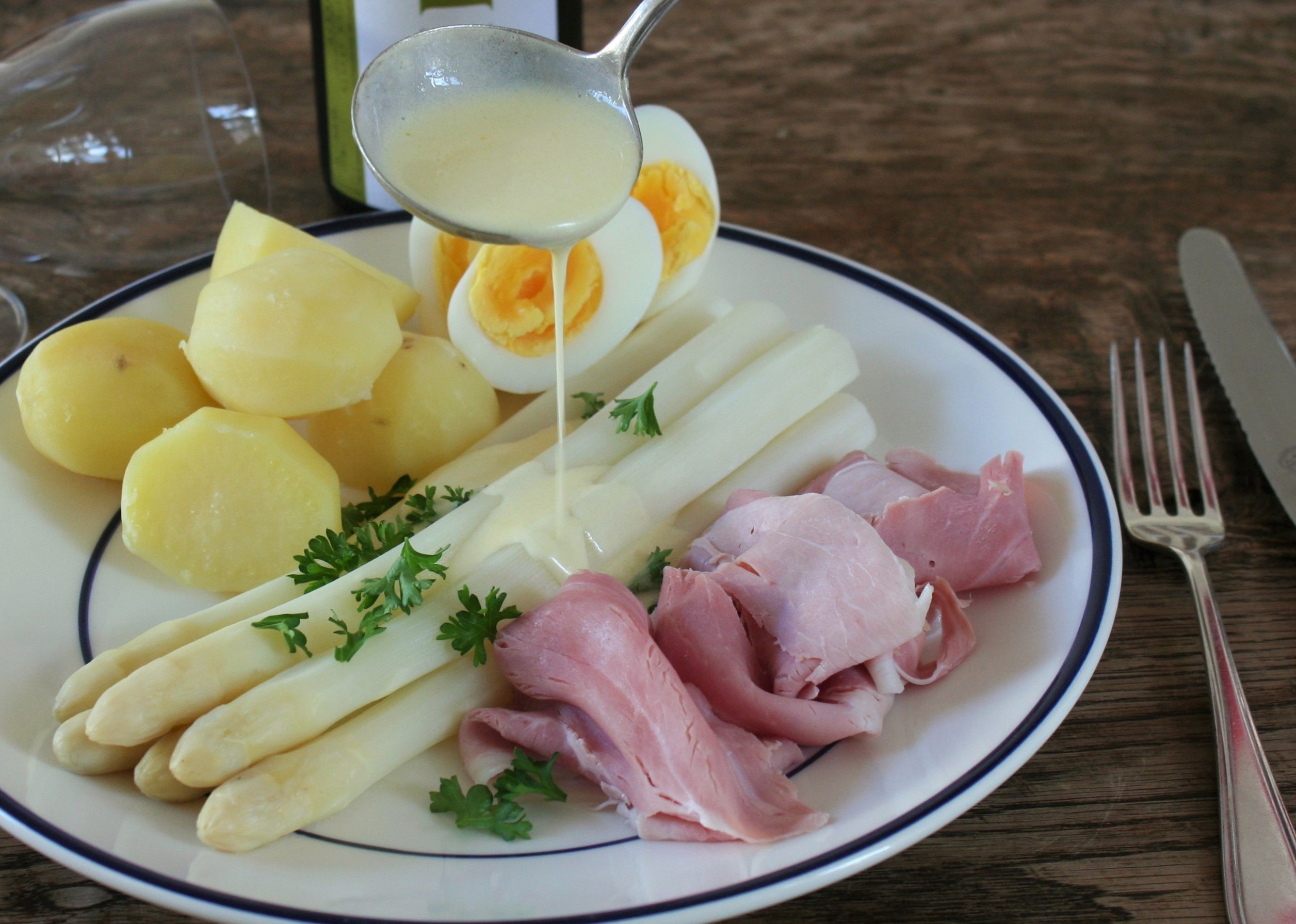 Klassieke asperges met beenham, ei en botersaus