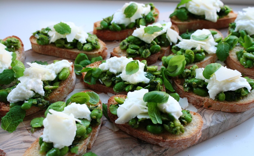 Tuinbonentoast met buffelmozarella, basilicum en munt