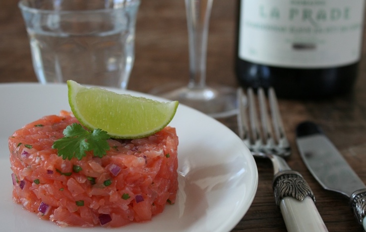 Zalmtartaar met koriander, limoen en rode ui