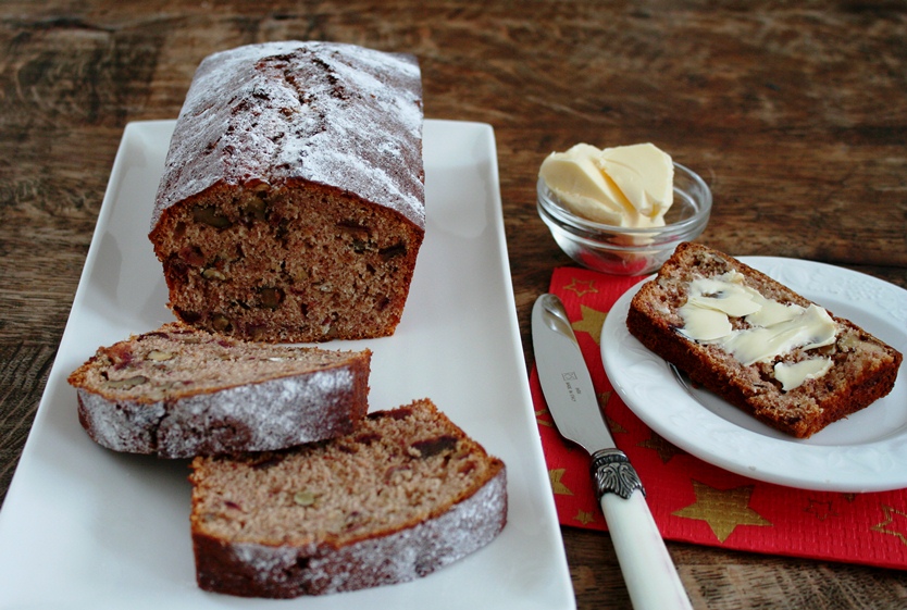Dit is een heerlijke cake! Ik maakte hem voor het ontbijt maar deze cake is ook prima te serveren bij een lekkere kop koffie. Delicious adviseert om er honing op te doen maar ik vond hem zo al zoet genoeg, een lik roomboter is wel lekker.